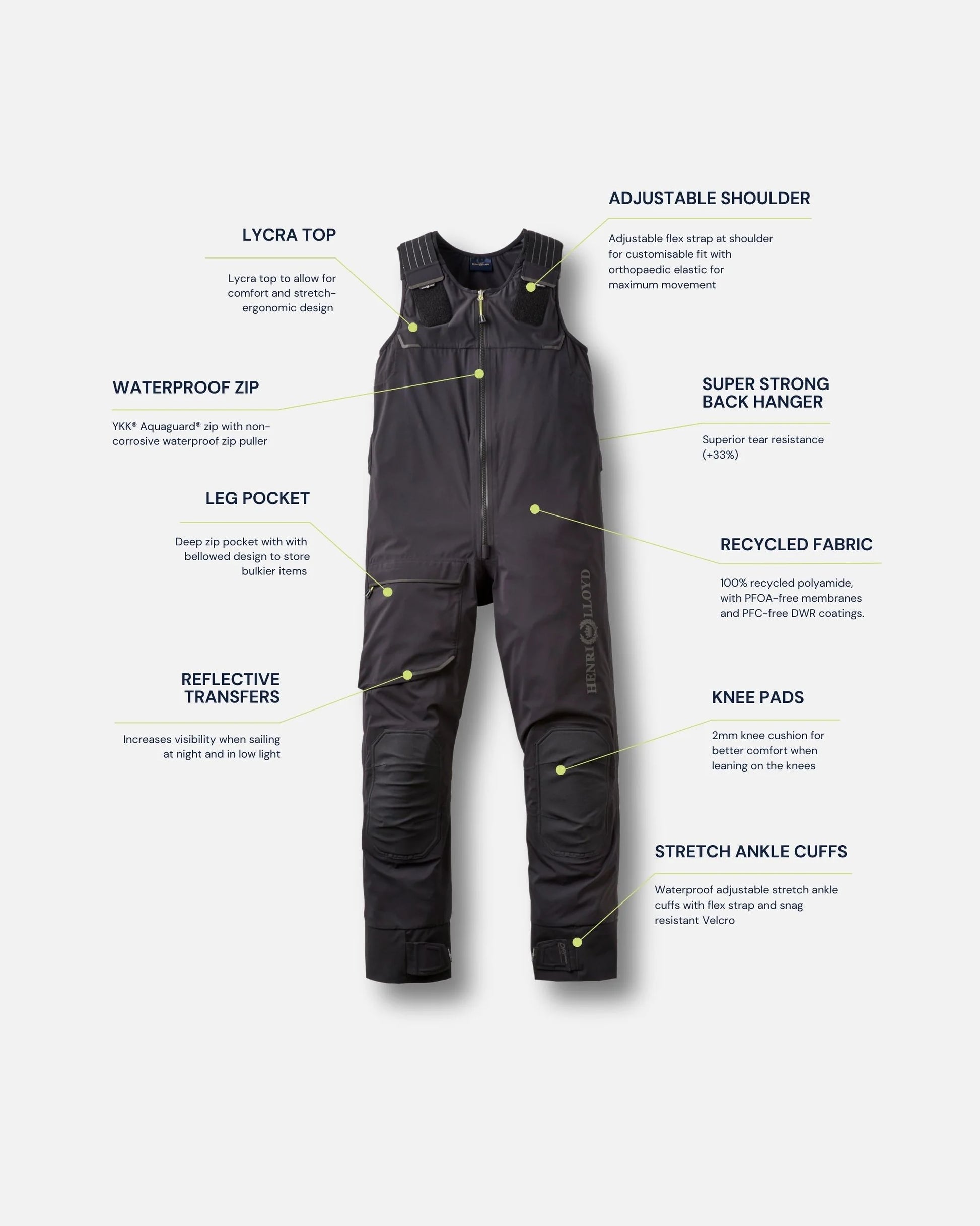 Engineered from over six decades of technical expertise and innovation, Henri-Lloyd’s Dynamic Salopettes are crafted from our exclusive DRI PRO lightweight stretch waterproof recycled fabric, featuring ergonomic design, reinforced patches, and adjustable flex straps, offering unparalleled comfort, durability, and waterproof protection for serious sailors seeking peak performance.